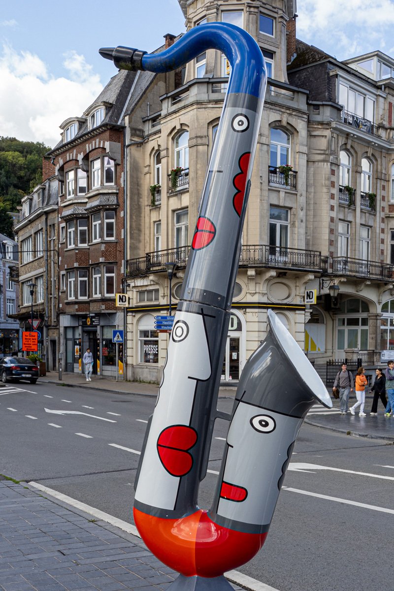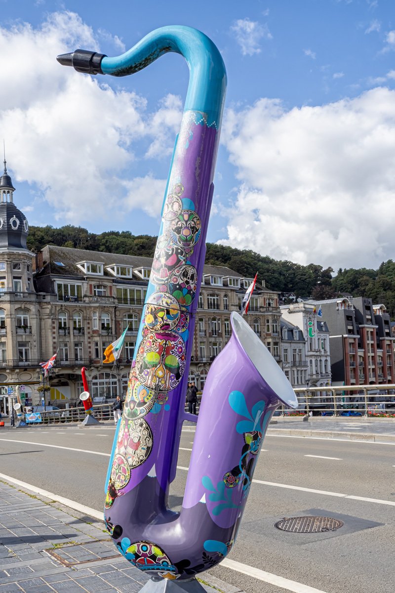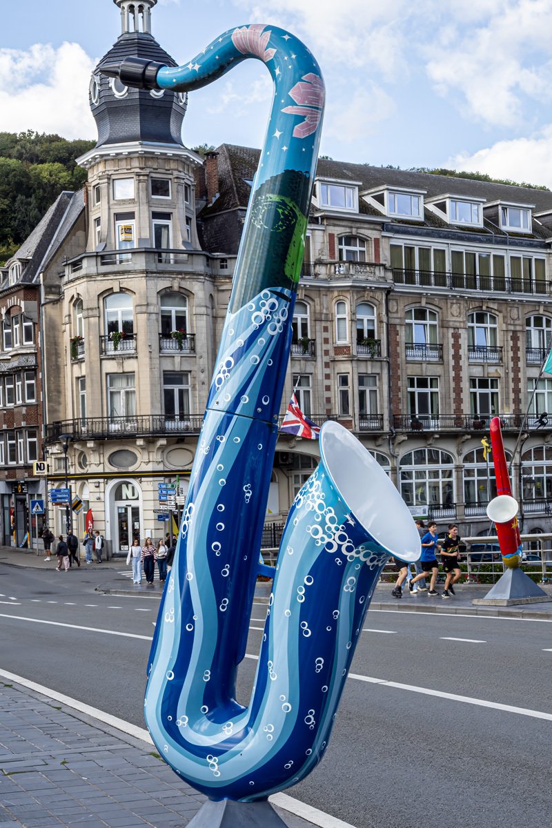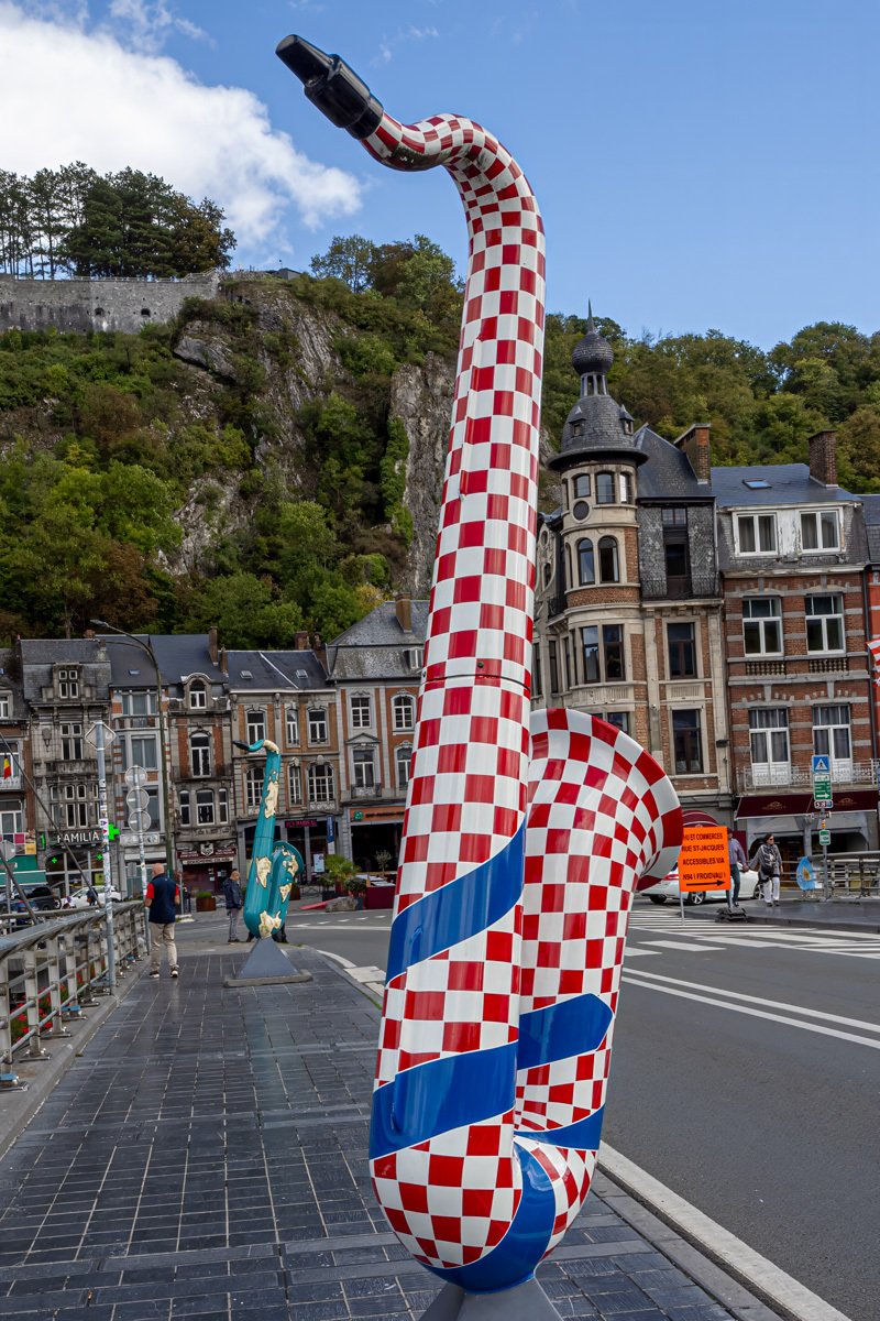 Today we hung around Dinant and enjoyed a more relaxing day. The inventor of the saxophone, Adolphe Sax, was born here in 1814, and the instrument has become a proud symbol of the city. The most obvious reminder is the giant painted fiberglass saxophones scattered throughout town. These were originally created for an art competition in 2010, with designs contributed by countries around the world. They say there’s a map to help you find them, but it’s not much help—it doesn’t show all the locations clearly, nor even how many there are. From what I could piece together, there are 35 in total, but with 4 on loan and 1 under repair, 30 remain in Dinant. Peggy and I made it our mission to hunt them down today and think we tracked 29 of them—so close to a clean sweep!
