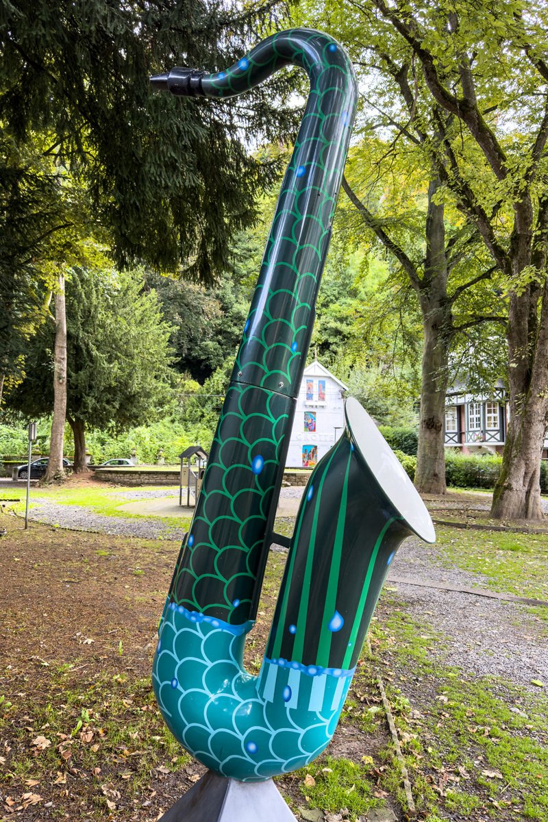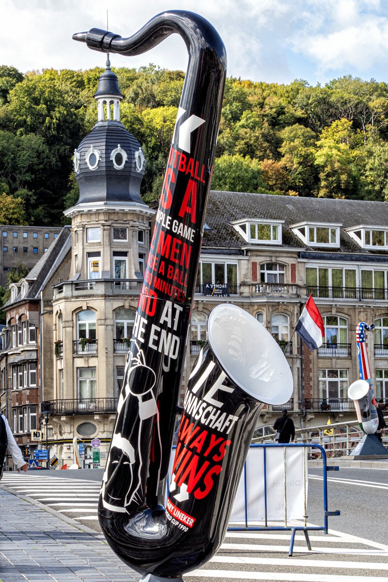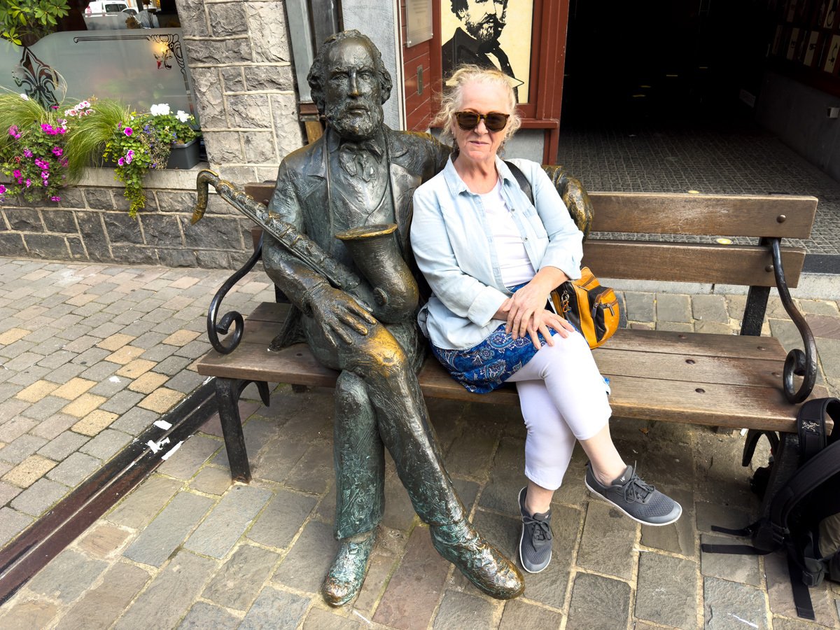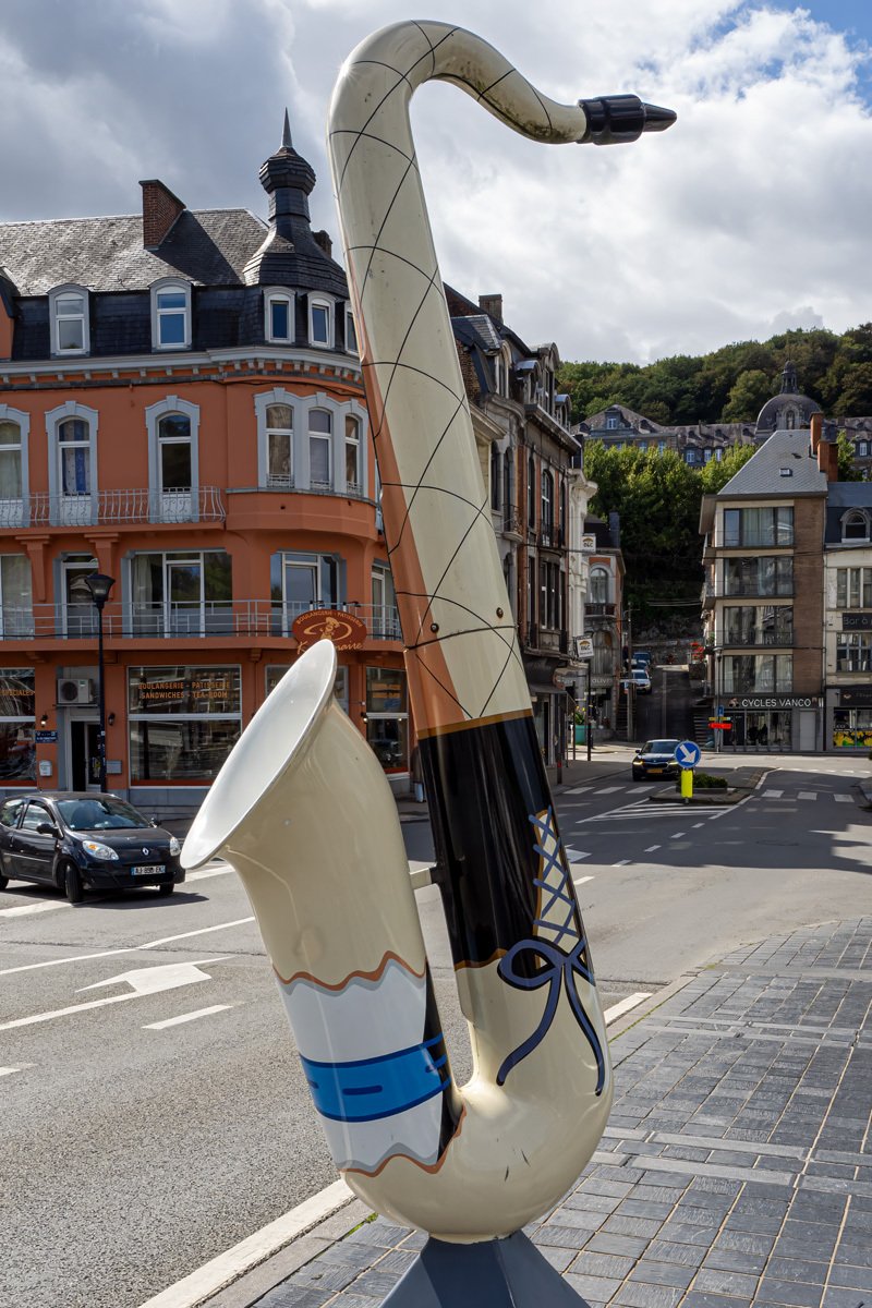 Today we hung around Dinant and enjoyed a more relaxing day. The inventor of the saxophone, Adolphe Sax, was born here in 1814, and the instrument has become a proud symbol of the city. The most obvious reminder is the giant painted fiberglass saxophones scattered throughout town. These were originally created for an art competition in 2010, with designs contributed by countries around the world. They say there’s a map to help you find them, but it’s not much help—it doesn’t show all the locations clearly, nor even how many there are. From what I could piece together, there are 35 in total, but with 4 on loan and 1 under repair, 30 remain in Dinant. Peggy and I made it our mission to hunt them down today and think we tracked 29 of them—so close to a clean sweep!