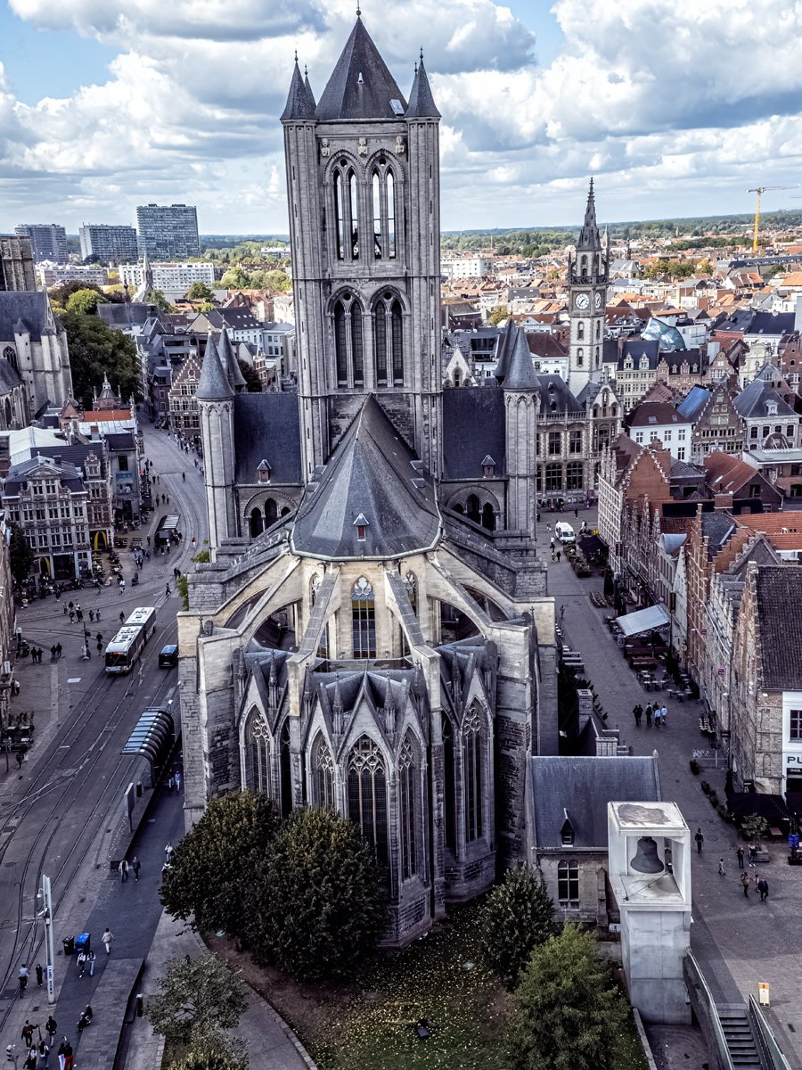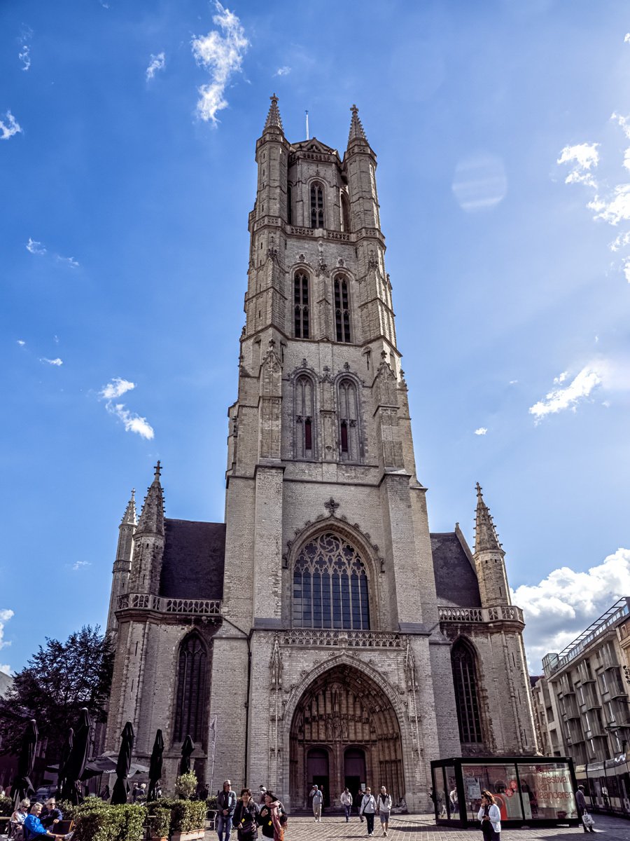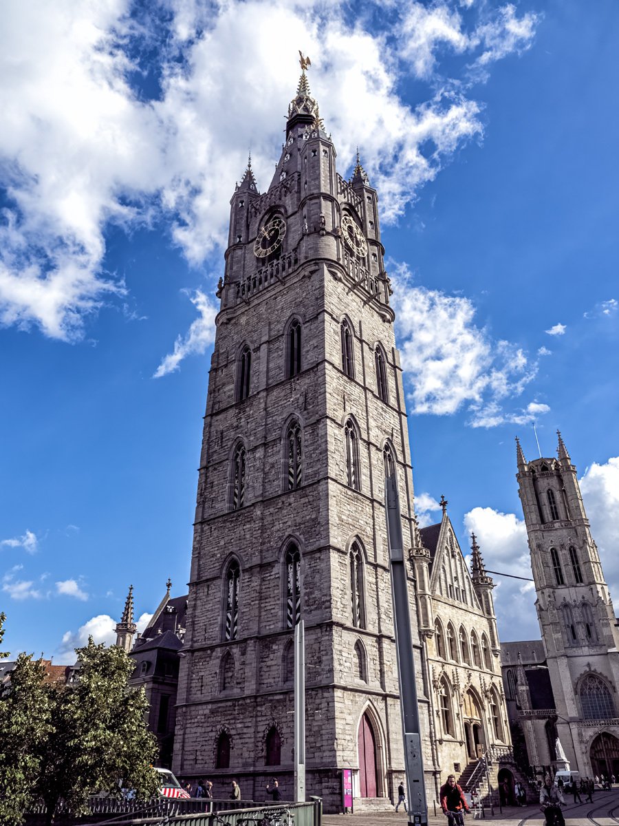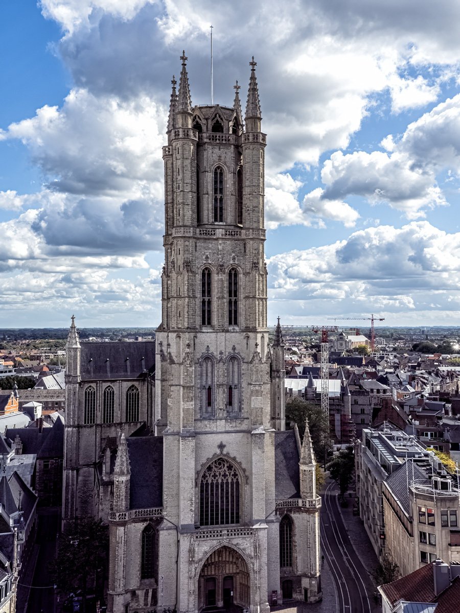 Once in town, we joined a walking tour that lasted about two hours, full of legends and quirky tales of Ghent’s past. Our guide was excellent—she clearly loved sharing the stories as much as we loved hearing them. Afterwards, we stepped into St. Bavo’s Cathedral, though we passed on seeing the famous Ghent Altarpiece—Jan van Eyck’s 1432 masterpiece that is often called the world’s first great oil painting. Instead, I climbed the Belfry of Ghent, a 91-meter medieval tower that’s part of a UNESCO World Heritage trio. The views from the top were worth every step. Peggy wisely chose to sit that one out and enjoyed a hot chocolate in a cozy café. We reunited to see St. Nicholas Church, which is lovely in its Gothic simplicity, though not quite on the scale of Antwerp’s mighty cathedral.
