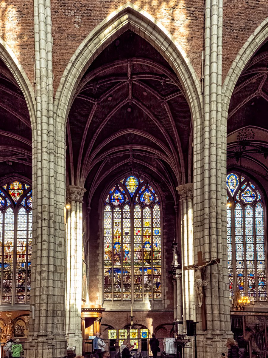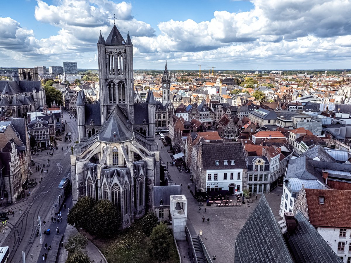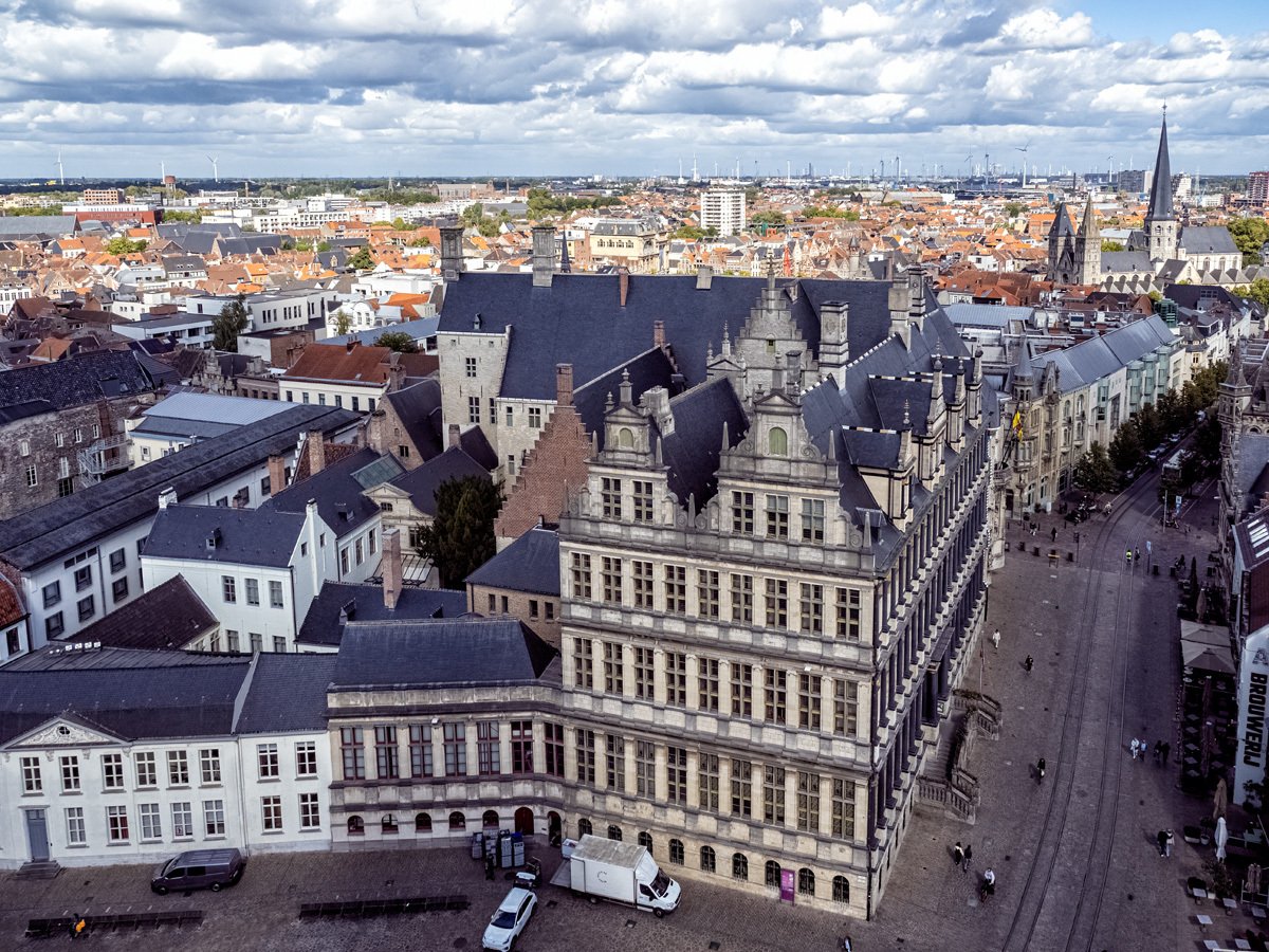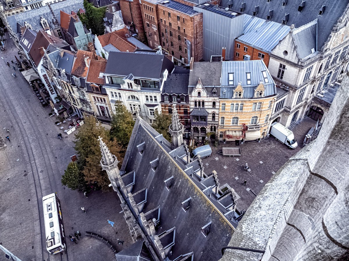 Once in town, we joined a walking tour that lasted about two hours, full of legends and quirky tales of Ghent’s past. Our guide was excellent—she clearly loved sharing the stories as much as we loved hearing them. Afterwards, we stepped into St. Bavo’s Cathedral, though we passed on seeing the famous Ghent Altarpiece—Jan van Eyck’s 1432 masterpiece that is often called the world’s first great oil painting. Instead, I climbed the Belfry of Ghent, a 91-meter medieval tower that’s part of a UNESCO World Heritage trio. The views from the top were worth every step. Peggy wisely chose to sit that one out and enjoyed a hot chocolate in a cozy café. We reunited to see St. Nicholas Church, which is lovely in its Gothic simplicity, though not quite on the scale of Antwerp’s mighty cathedral.