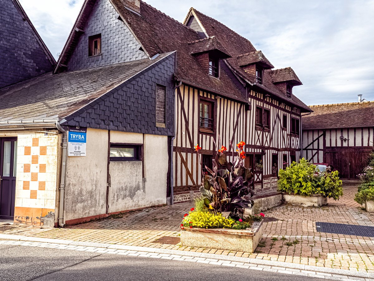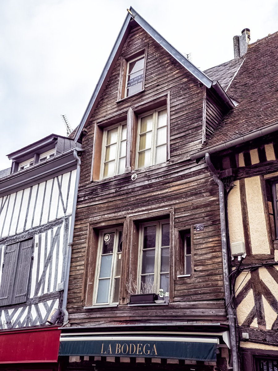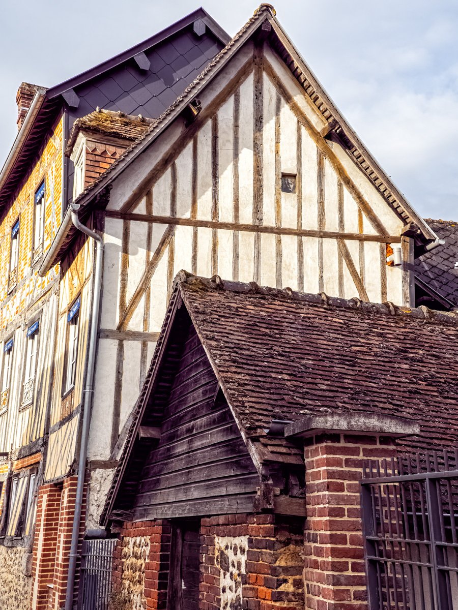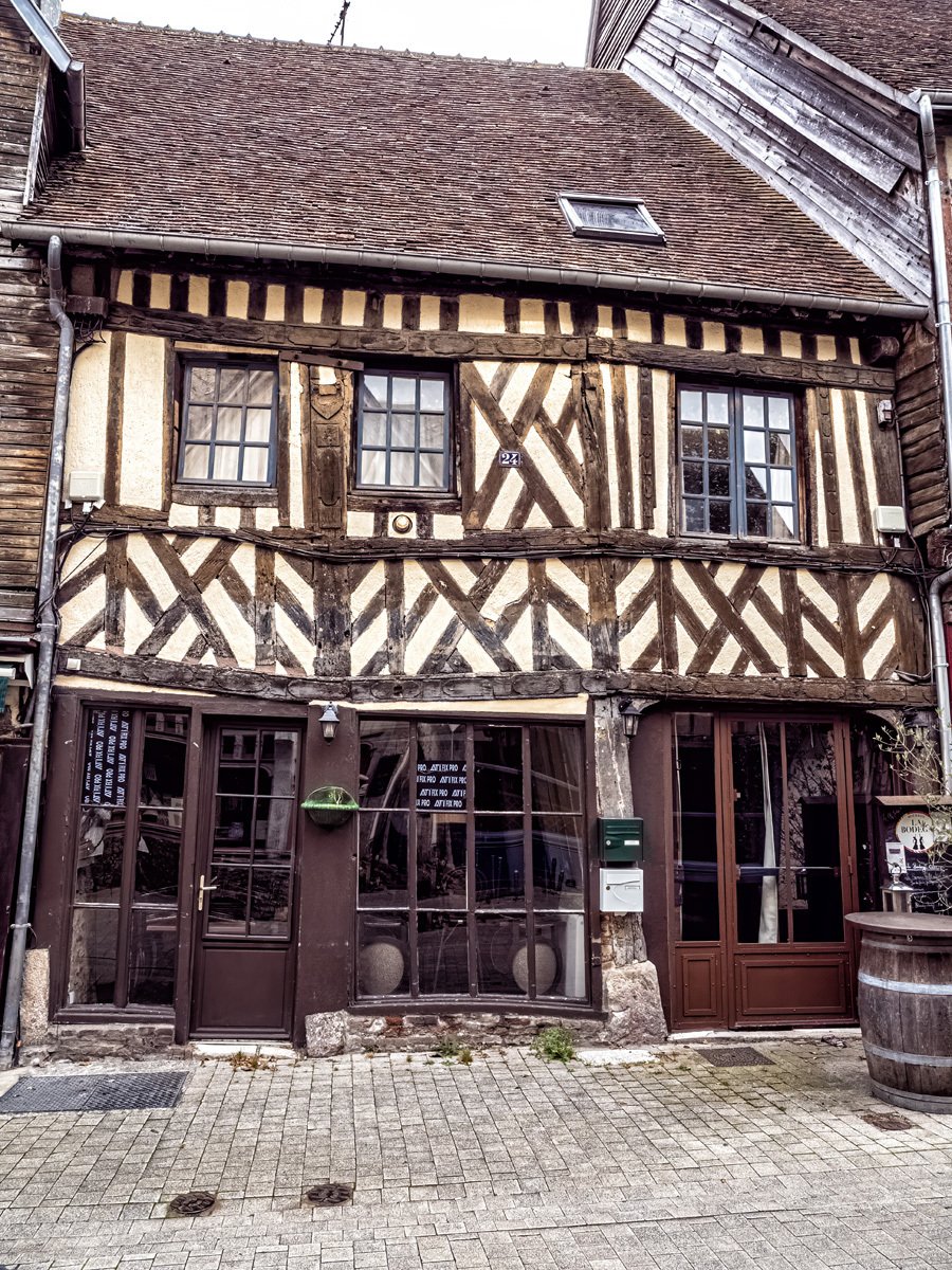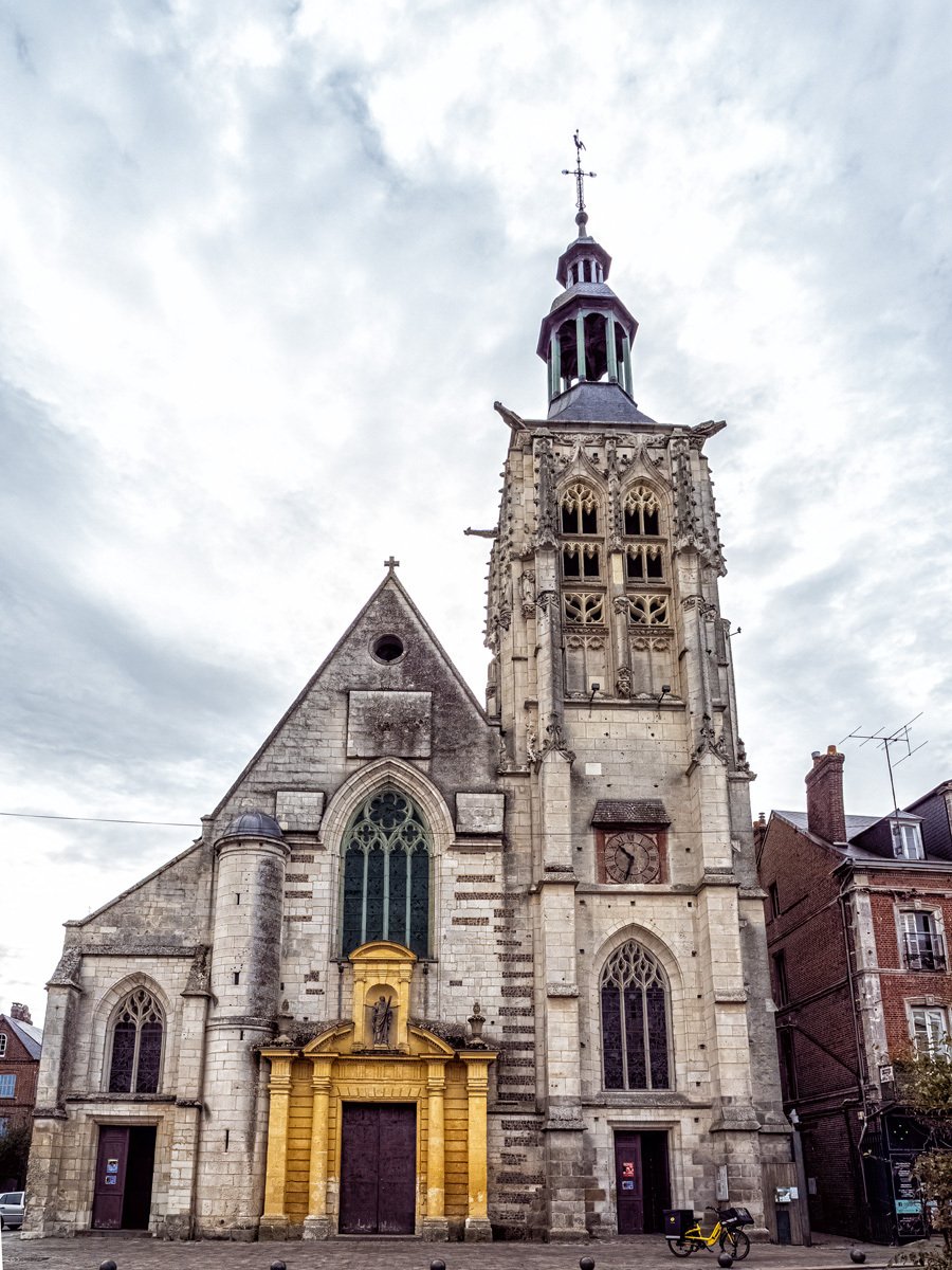 Got up this morning and went over to Bernay, a charming Norman town that turned out to be much bigger than I expected. We sampled some of the historic architecture before heading into Église Sainte-Croix, built in the 14th century on the site of a former abbey. The interior was a surprise with its timber-beamed ceiling and colorful stained glass. Like many French parish churches, it also houses a war memorial to local soldiers lost in both World Wars.