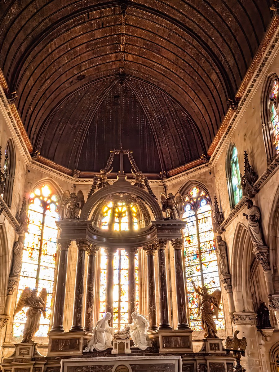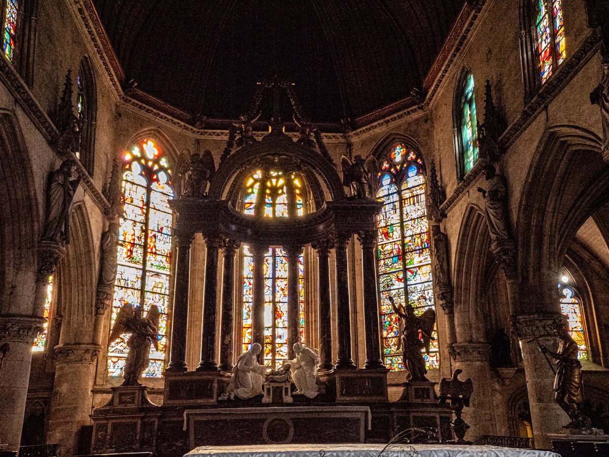 We then headed back to Lisieux to see the Cathédrale Saint-Pierre, one of the earliest Gothic cathedrals in Normandy, built between the 12th and 13th centuries. Its soaring nave and elegant stone carvings were magnificent. Afterward, Peggy went back to the apartment for a break while I soldiered on to the Basilica of Sainte-Thérèse, completed in 1954 in a Romano-Byzantine style. It is one of the largest churches built in France during the 20th century, and also one of the most beautiful religious buildings I’ve ever been in. The mosaics are so dazzling they practically glow from every wall and ceiling.