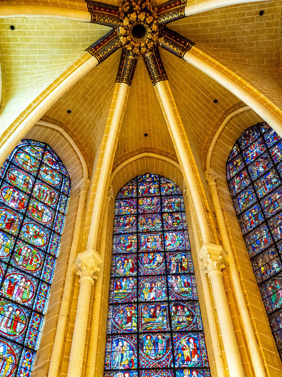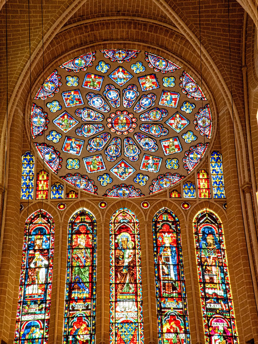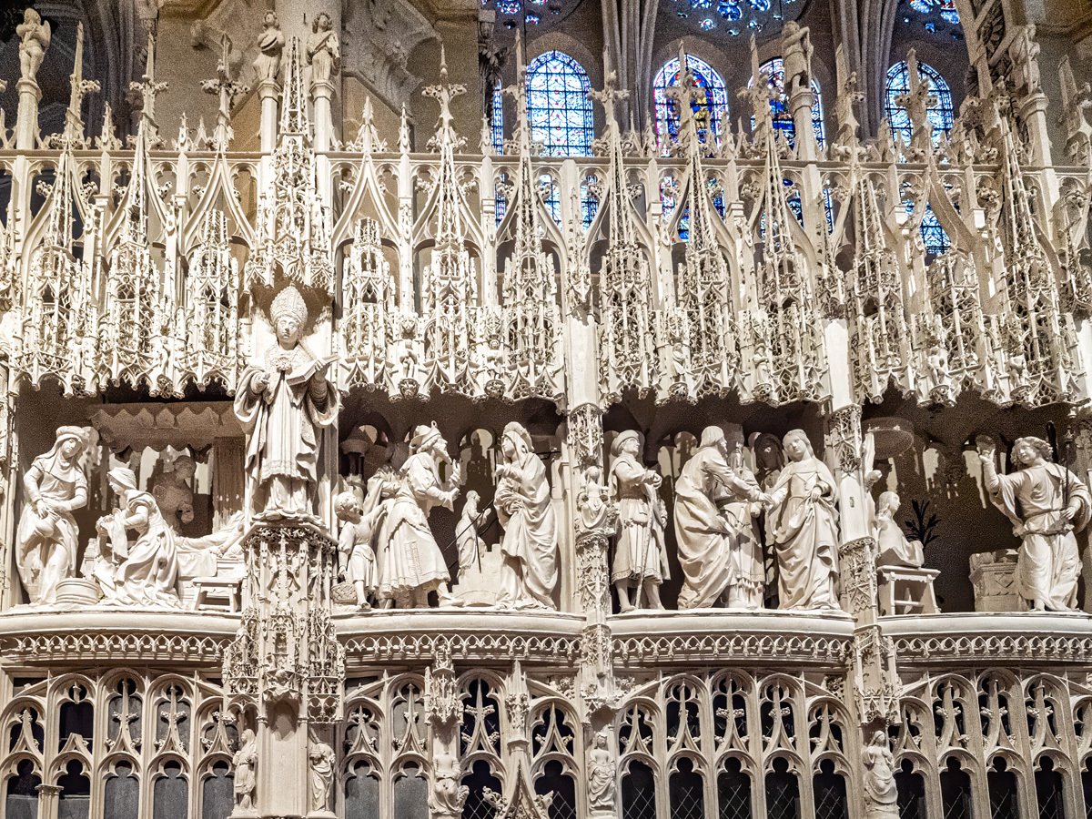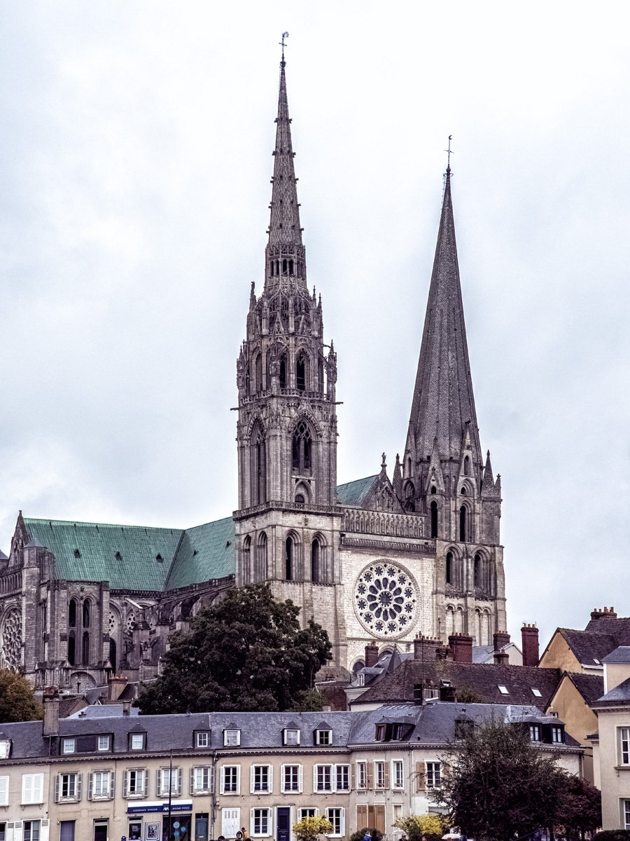 We drove a couple of hours through drizzle on our way to Chartres. On the way into town we spotted a supermarché and stocked up on supplies for our Airbnb. Too early to check in, we headed straight to Chartres’ crown jewel: Notre-Dame Cathedral, one of the finest examples of French Gothic architecture. Built mostly in the 12th and 13th centuries, it’s famed for its magnificent stained glass windows and its elaborate sculpted choir screen that tells biblical stories in stone.