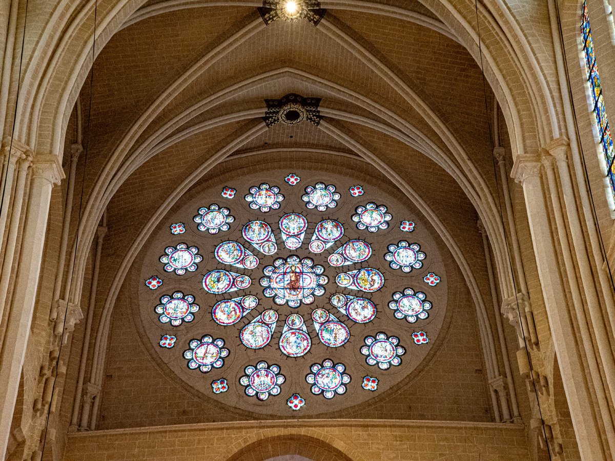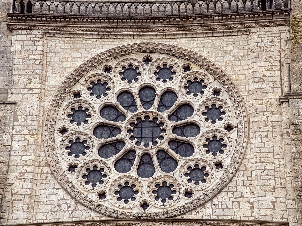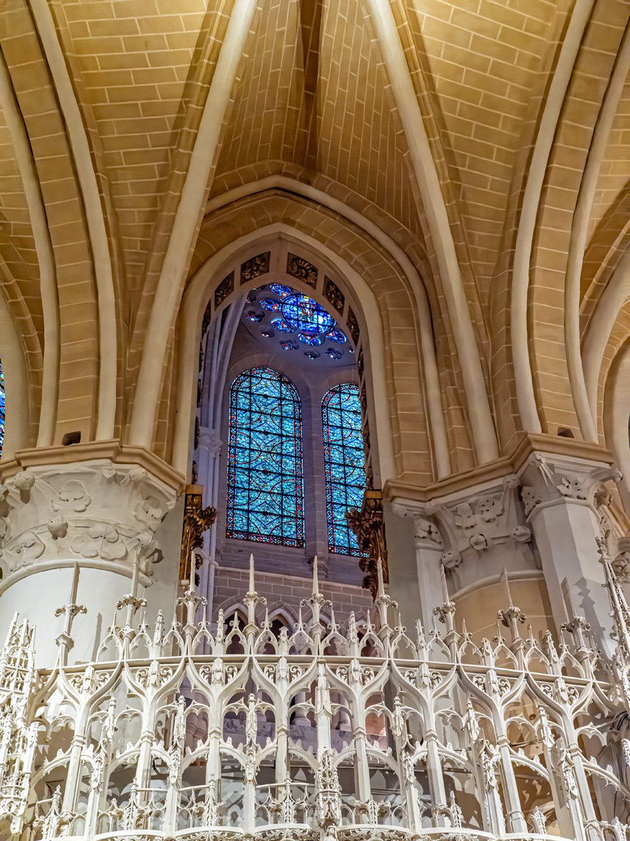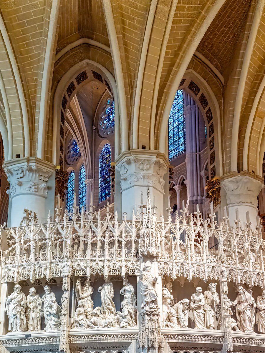 We drove a couple of hours through drizzle on our way to Chartres. On the way into town we spotted a supermarché and stocked up on supplies for our Airbnb. Too early to check in, we headed straight to Chartres’ crown jewel: Notre-Dame Cathedral, one of the finest examples of French Gothic architecture. Built mostly in the 12th and 13th centuries, it’s famed for its magnificent stained glass windows and its elaborate sculpted choir screen that tells biblical stories in stone.