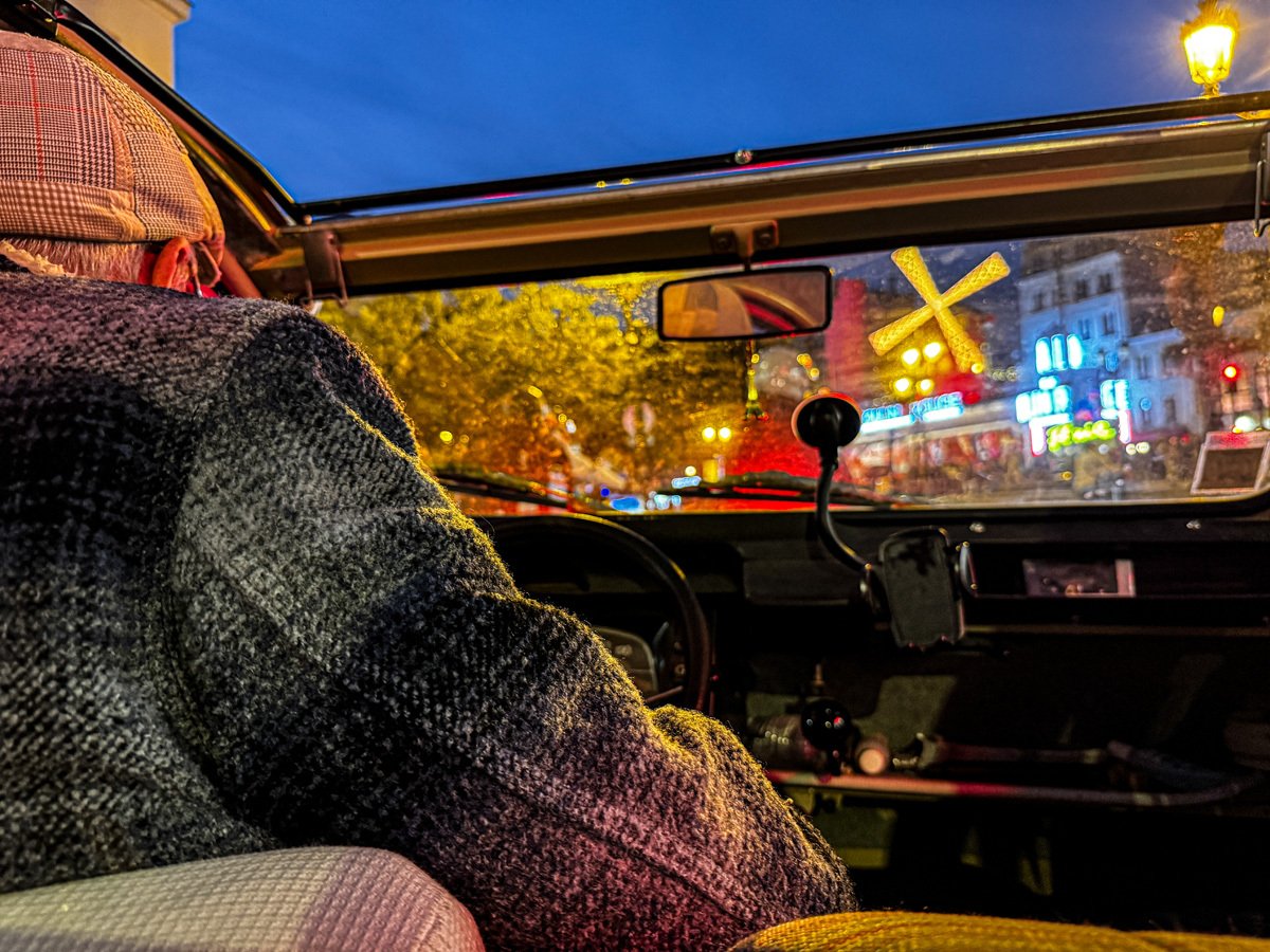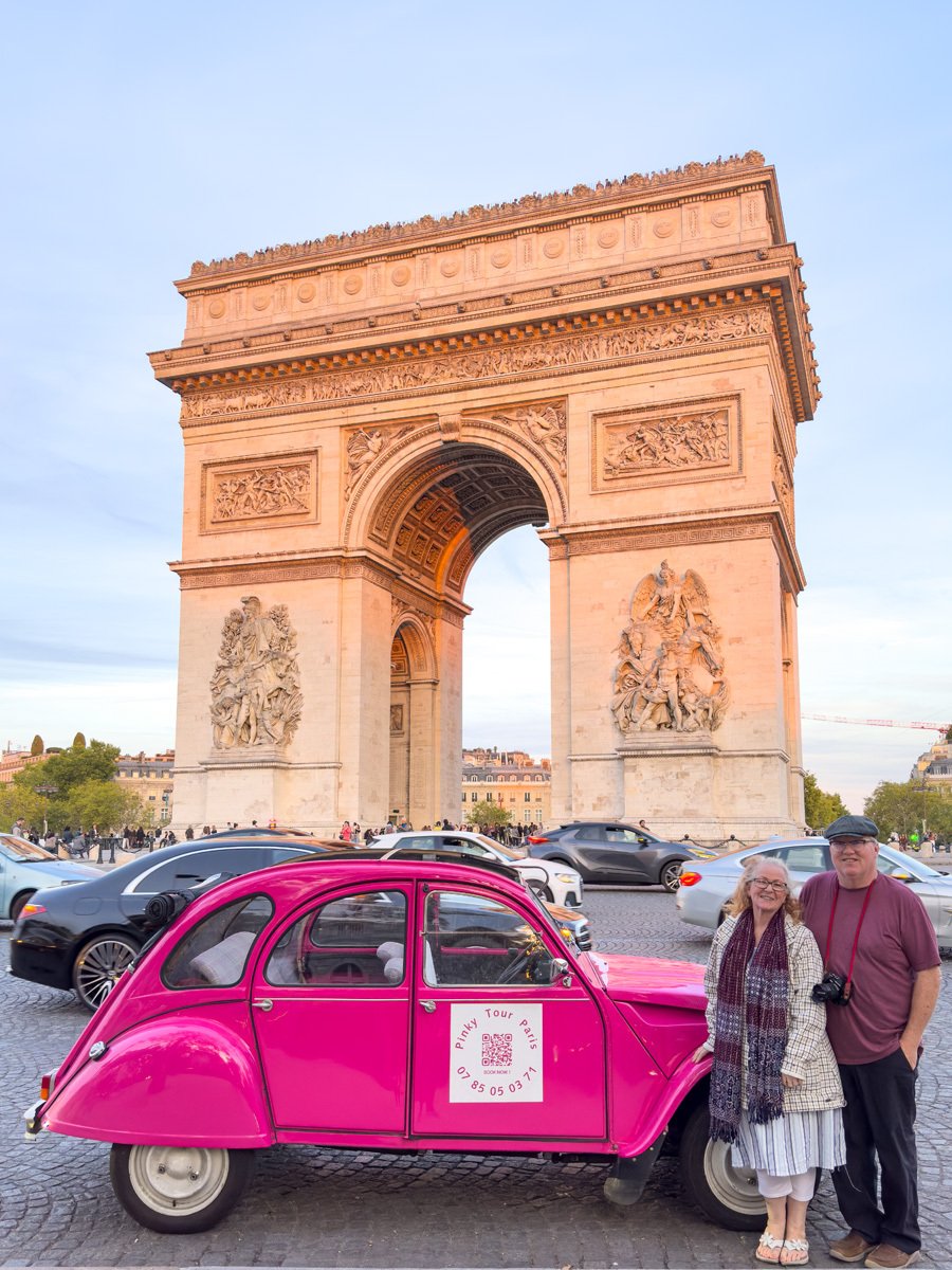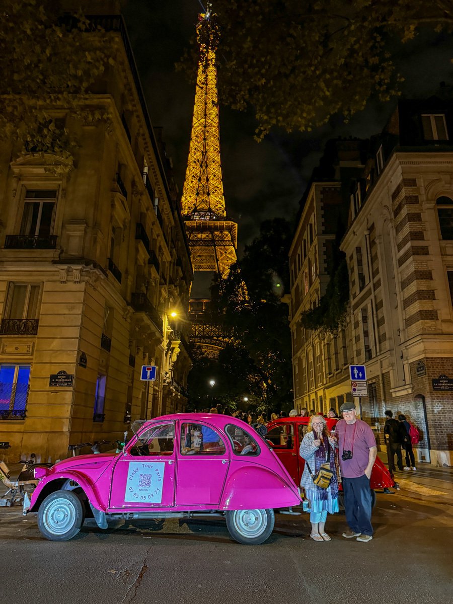 But the day wasn’t done! At 7:00 we were picked up in a bubblegum-pink Citroën for an evening tour. Our driver whisked us through Parisian streets, past the Arc again and up into Montmartre. We stopped for pictures, soaked in the lively atmosphere, and ended with a toast of champagne at a secluded viewpoint of the Eiffel Tower sparkling against the night sky. A perfect way to celebrate our trip!