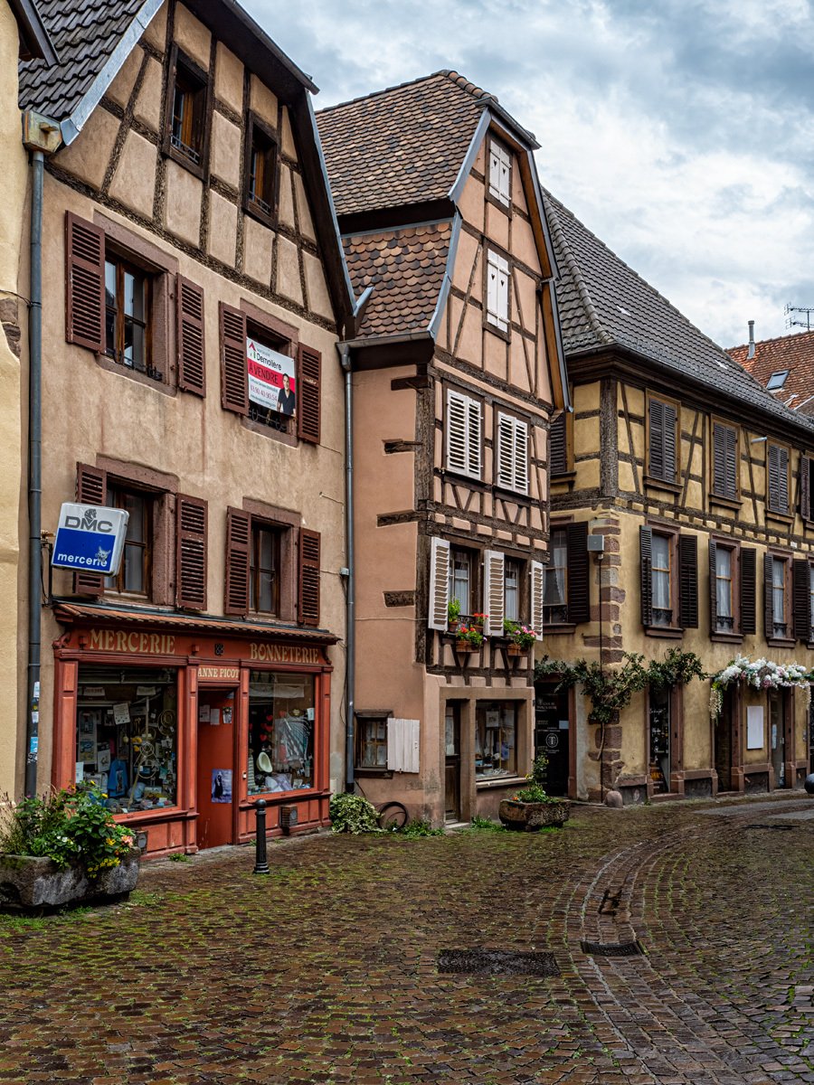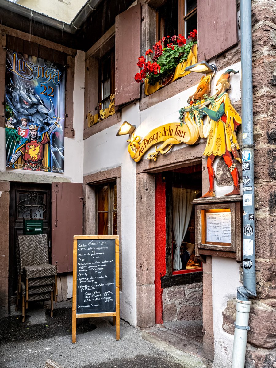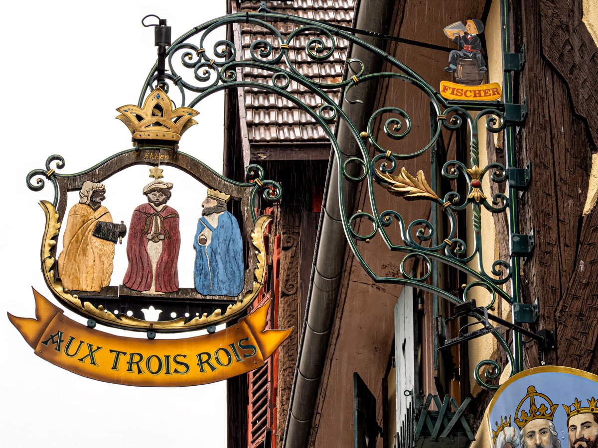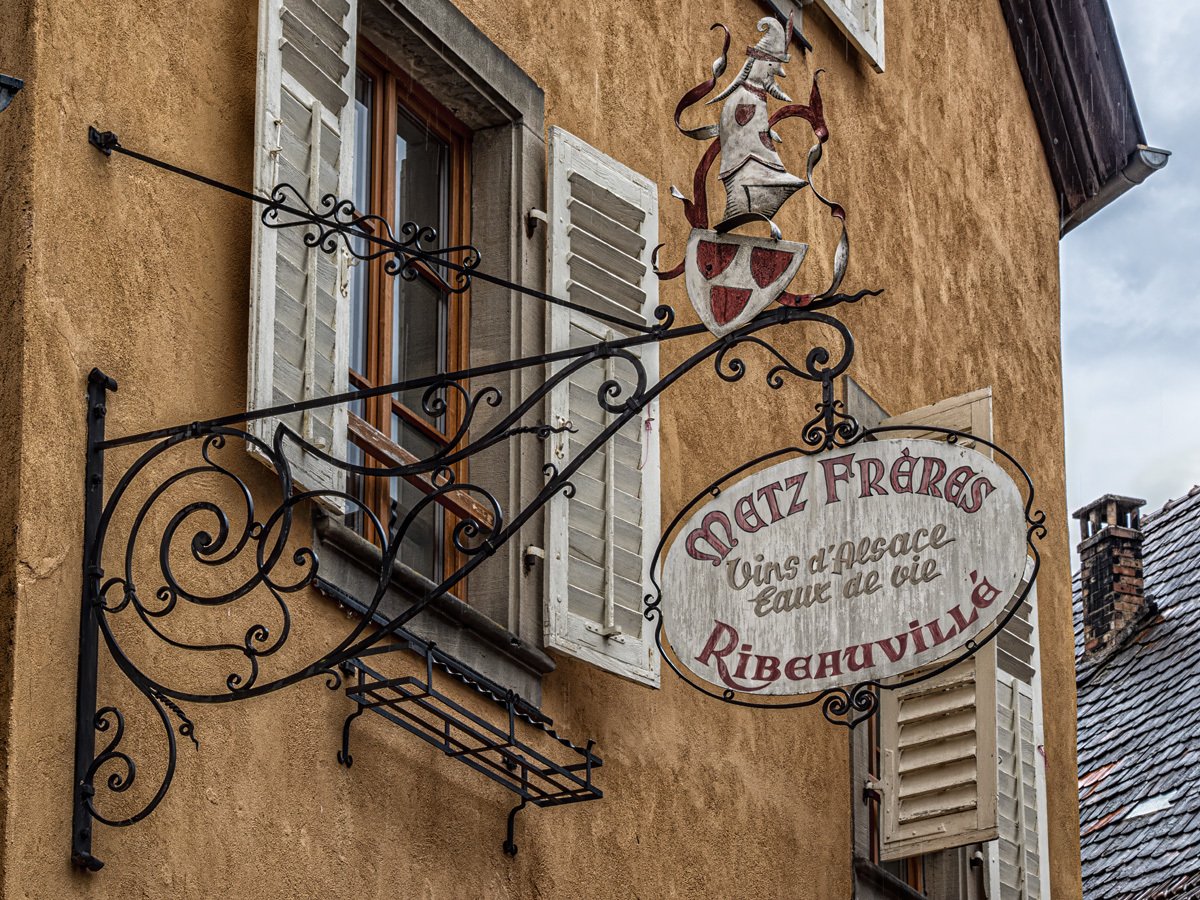 The town was every bit as picturesque as we remembered: more half-timbered houses leaning over cobbled lanes, and those wonderful wrought-iron signs swinging above the shops. This Alsatian tradition dates back to the Middle Ages, when many people were illiterate and shopkeepers used illustrated signs—like a pretzel for a bakery or a boot for a cobbler—to advertise their trade. Ribeauvillé itself has deep roots too, once ruled by the Lords of Ribeaupierre, who built the three castles that still watch over the town from the surrounding hills.
