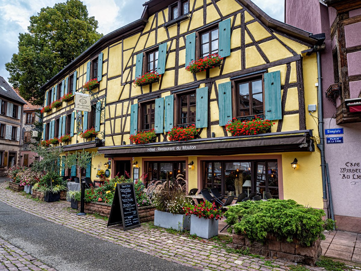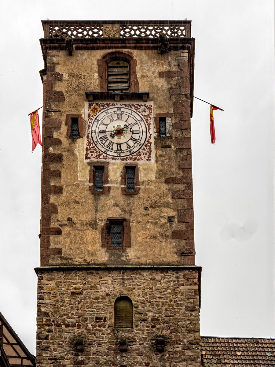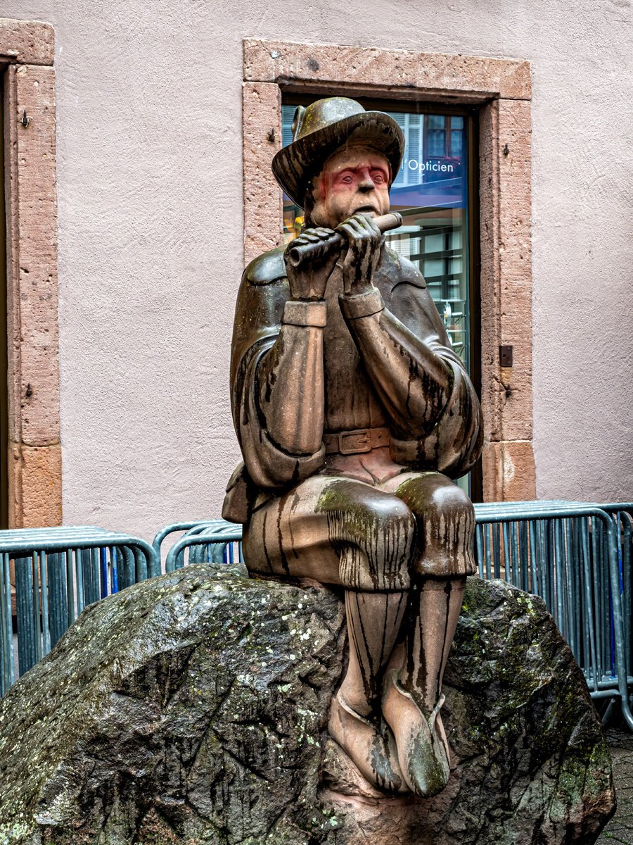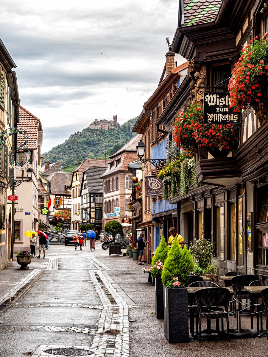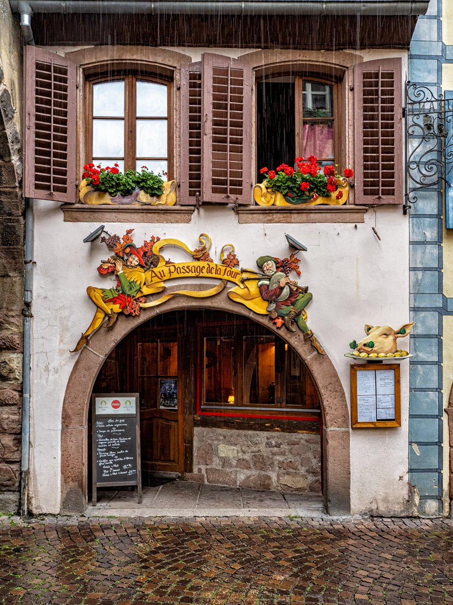 The town was every bit as picturesque as we remembered: more half-timbered houses leaning over cobbled lanes, and those wonderful wrought-iron signs swinging above the shops. This Alsatian tradition dates back to the Middle Ages, when many people were illiterate and shopkeepers used illustrated signs—like a pretzel for a bakery or a boot for a cobbler—to advertise their trade. Ribeauvillé itself has deep roots too, once ruled by the Lords of Ribeaupierre, who built the three castles that still watch over the town from the surrounding hills.