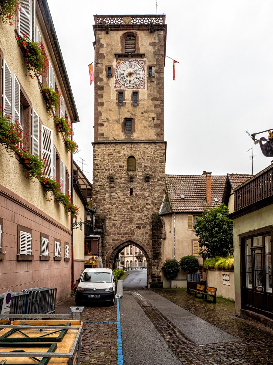 By the time we got to our final stop the skies had turned blue and the air was warming up. Feeling optimistic, we left the rain gear in the car—a decision we’d regret later. Ribeauvillé was another familiar stop from our 2018 Christmas market trip, though this time the charm came with a little extra chaos. Finding a parking spot was confusing, and I somehow ended up driving the car through the narrow medieval streets. Not my idea of fun.