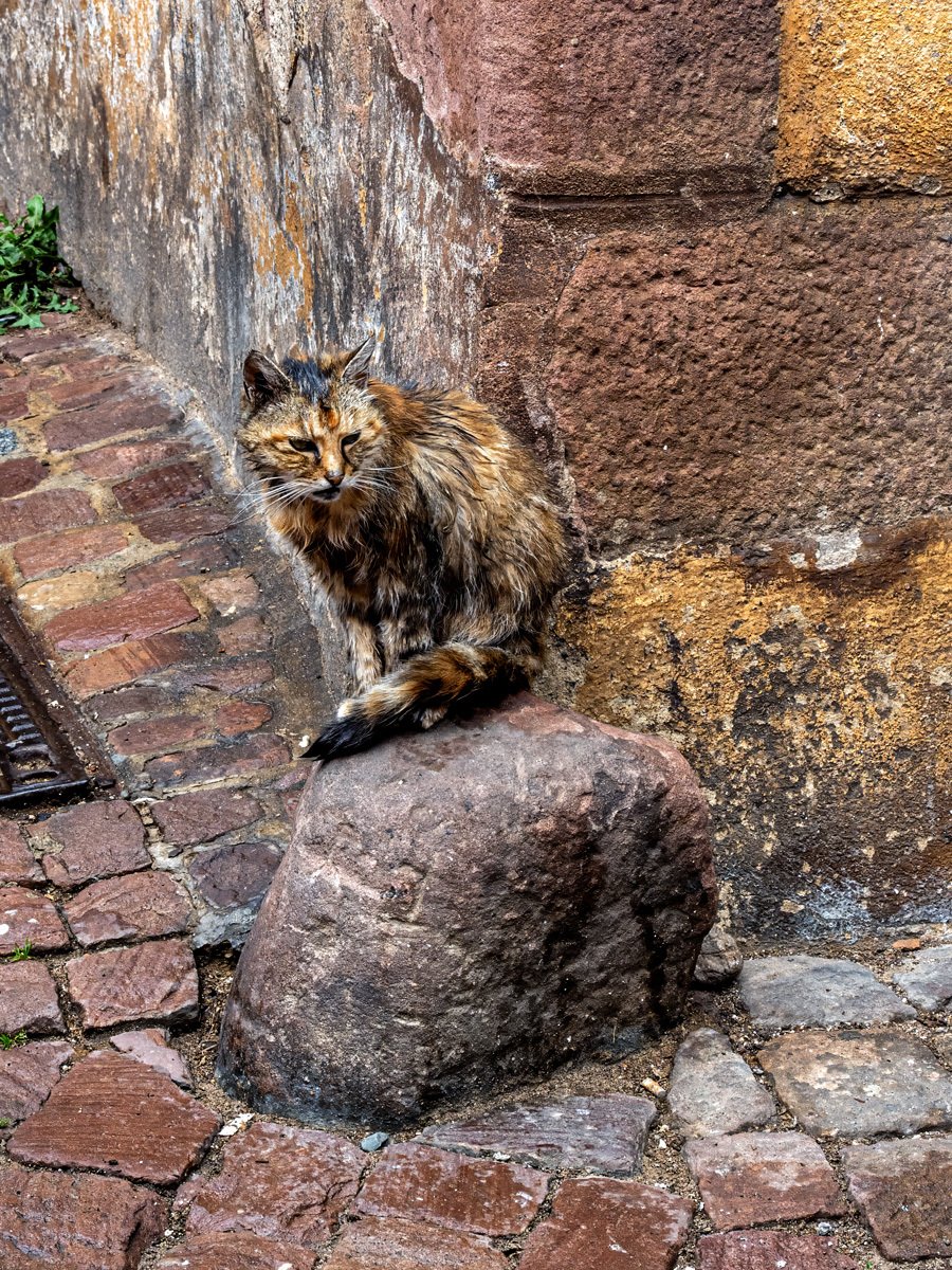 And it rains. By the time we rolled into Riquewihr, it was clear we’d need the rain jackets and umbrellas—and sure enough, we did. It wasn’t the most fun to trudge through puddles, but we didn’t let it dampen our spirits. We walked the length of the town until we reached the medieval gates, where a very soggy cat sat on a stone. I wasn’t sure if he was there to greet us or to send us off on some medieval quest.