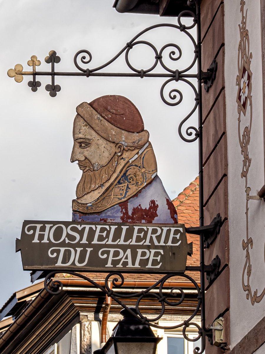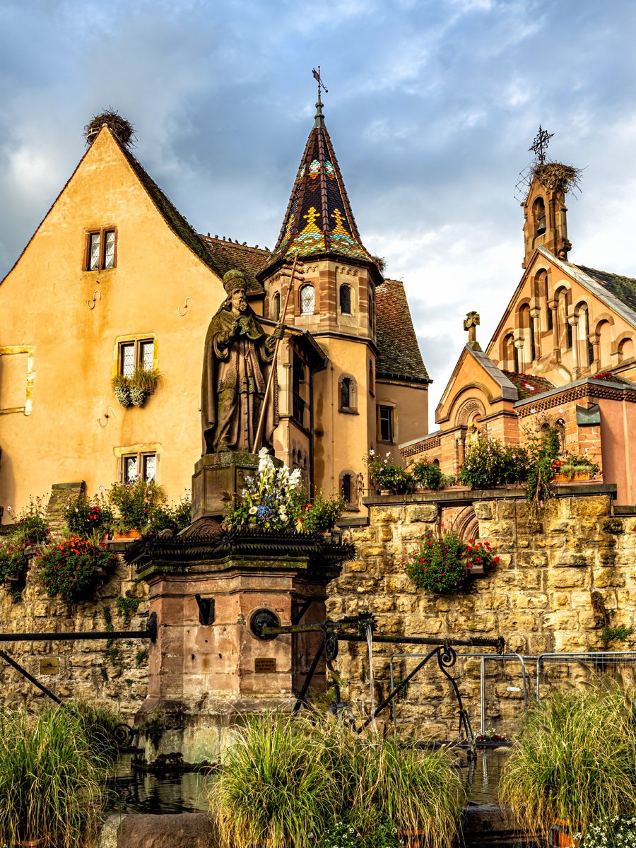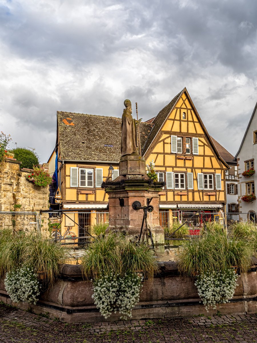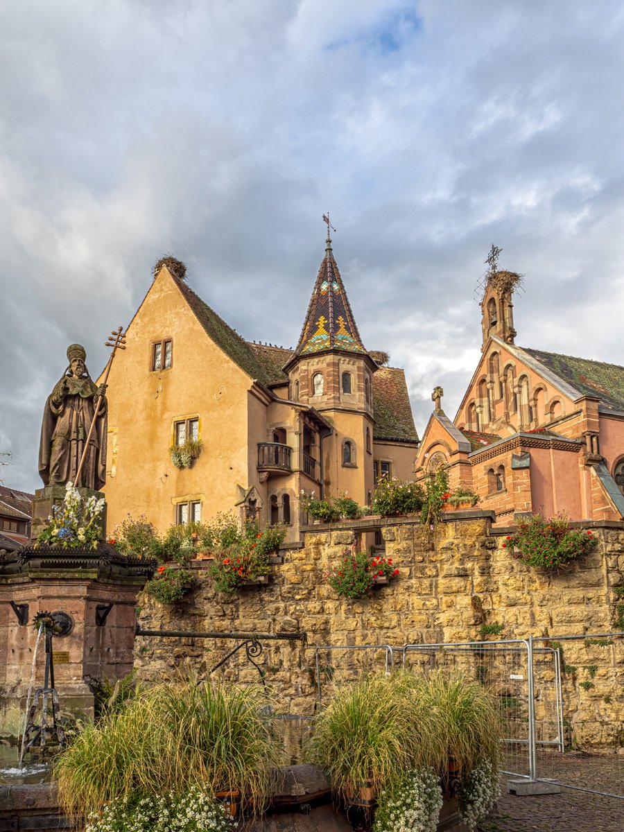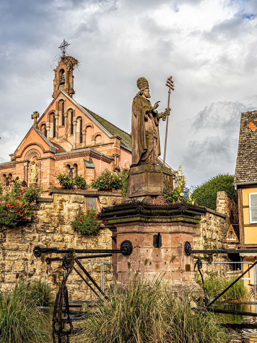 Peggy fueled up with her morning coffee while I grabbed—yes, another—chocolate croissant. We made our way to the heart of the village, where the Church of Saint Peter and Saint Paul sits beside the fountain and square. Built in the 13th century and later rebuilt in the 1800s, it’s a beautiful example of Alsatian religious architecture. Inside is a treasured Romanesque statue of the Virgin Mary, venerated for centuries by pilgrims. Eguisheim is also the birthplace of Pope Leo IX (1002–1054), one of the great reforming popes of the Middle Ages, whose legacy still connects this tiny village to the wider history of Europe.