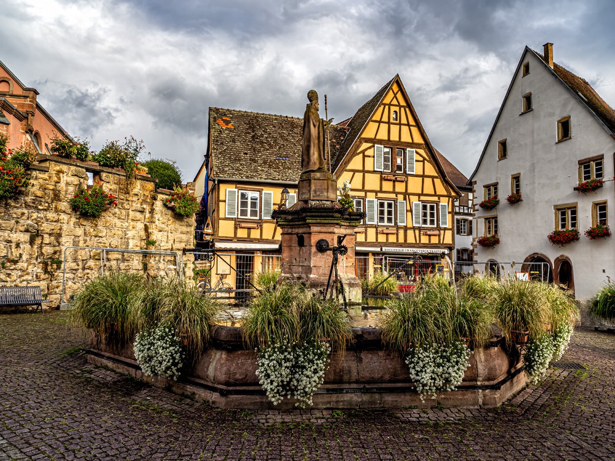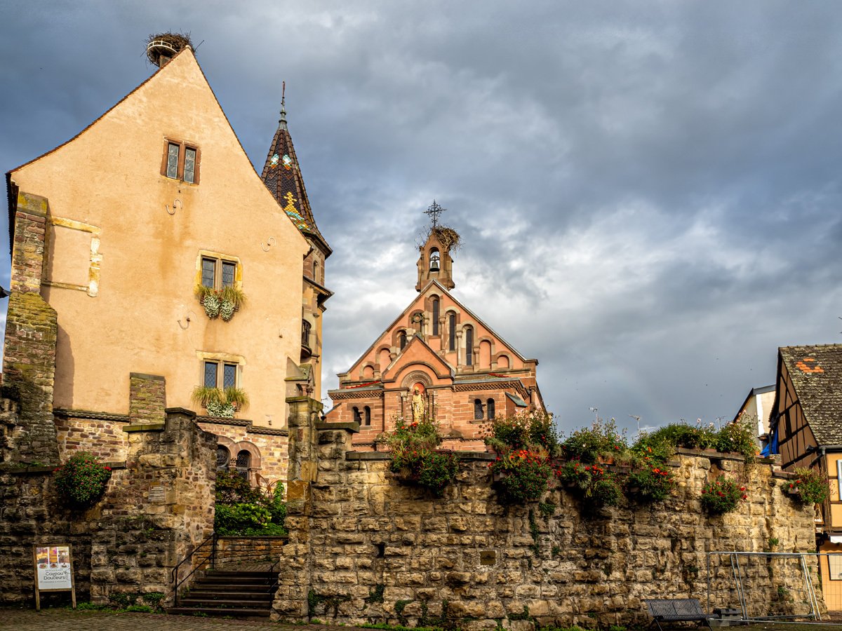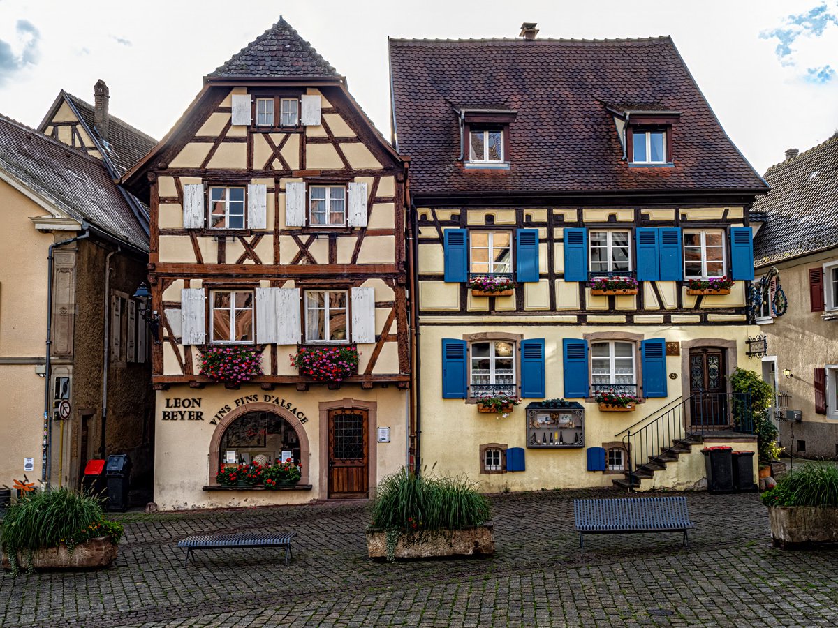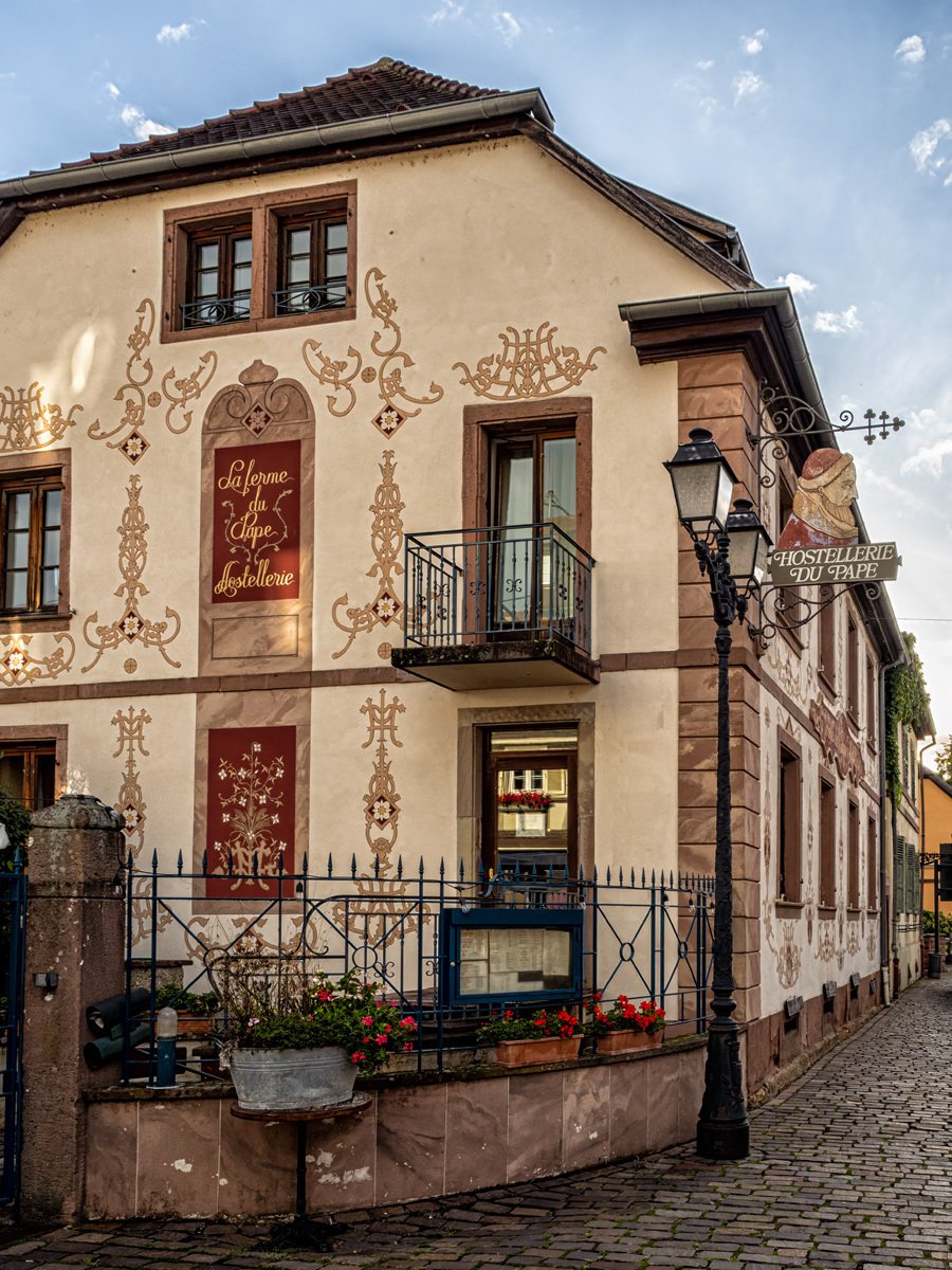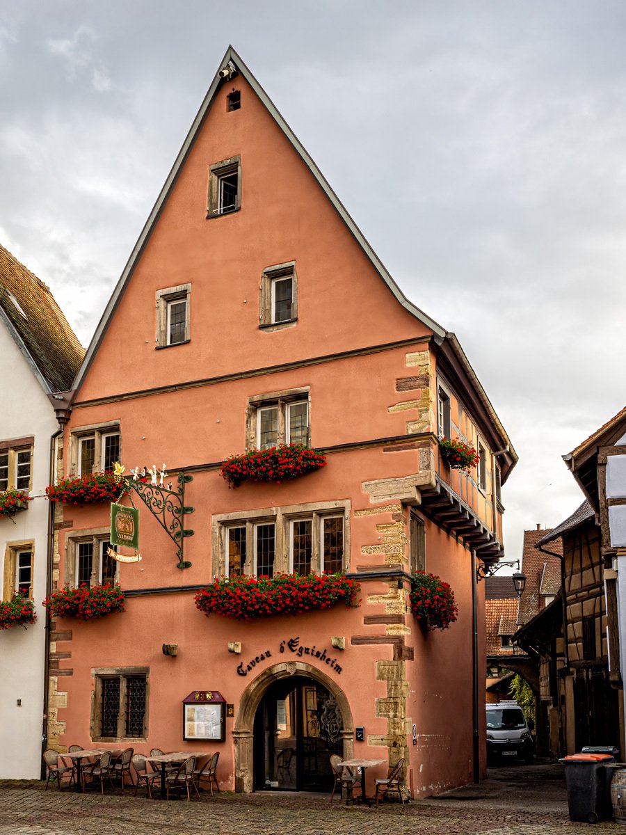 Before heading across the border to Germany, Peggy and I made a morning stop in Eguisheim. We’d last seen it during the Christmas market of 2018, and this time we wanted to catch it under more “normal” conditions. Arriving around 8 a.m. meant the streets were still calm, with only locals moving about before the tour buses began their invasion. Out of all the Alsace wine-route villages, Eguisheim may be the most magical—a true storybook village with its concentric cobblestone streets, half-timbered houses splashed in pastel colors, and flowers bursting from every window box. It’s little wonder it was once voted “France’s Favorite Village.”