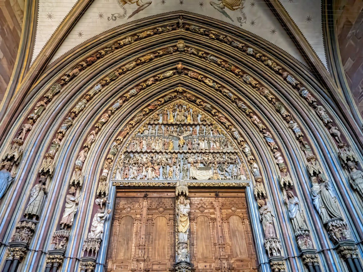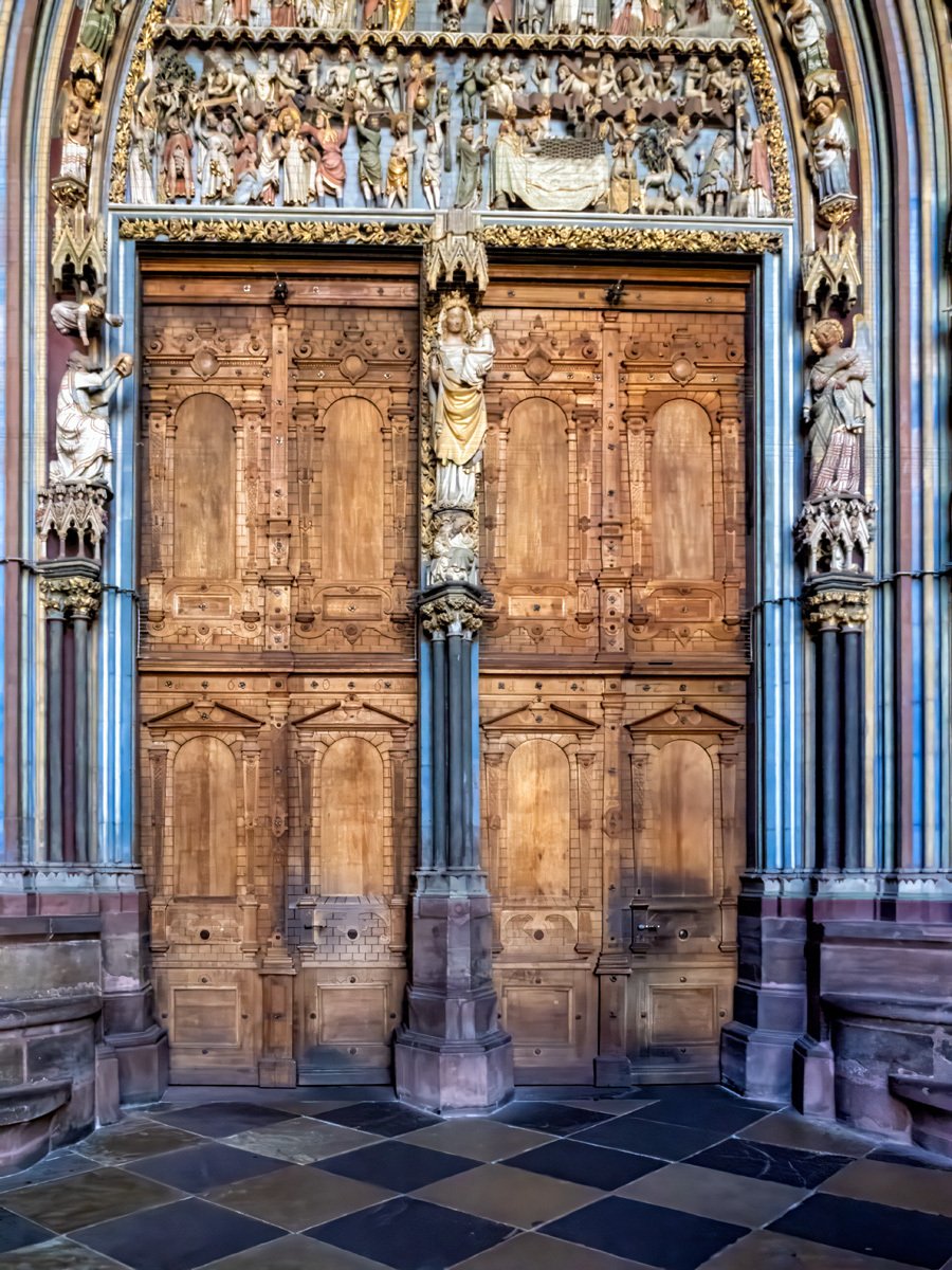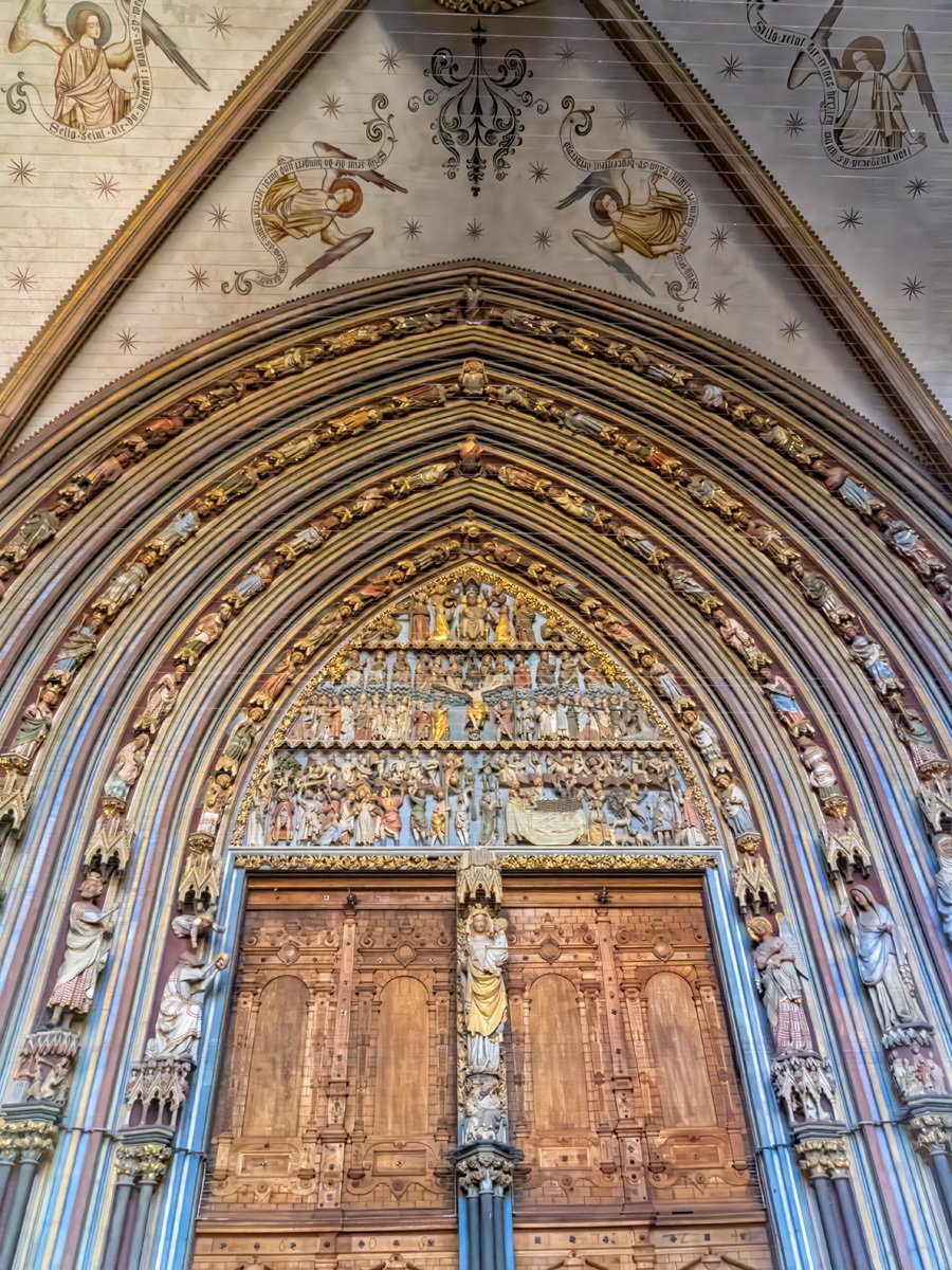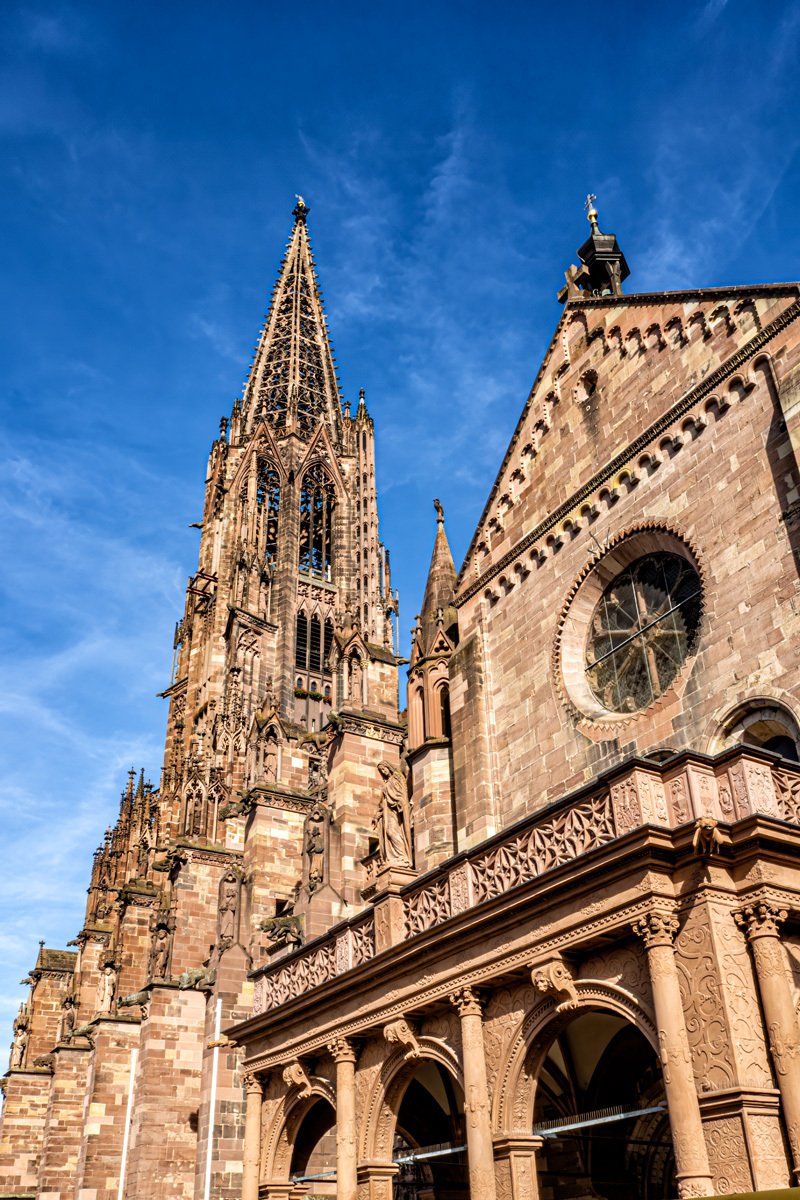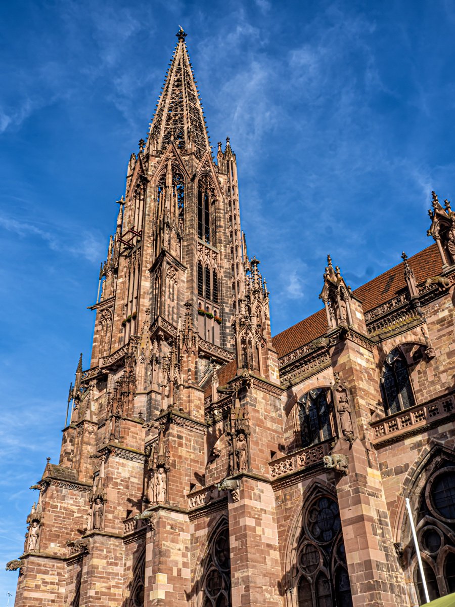 The Freiburg Minster (Münster) is indeed a mighty fine cathedral. When its 116-meter spire was completed in 1330, it was considered the tallest building in the world for a time ⛪. Even more remarkable, it’s the only Gothic cathedral in Germany built and finished in the Middle Ages that still stands in its original form. The stained glass windows glowed in the morning light—many of them were saved before the bombing and then returned after the war.