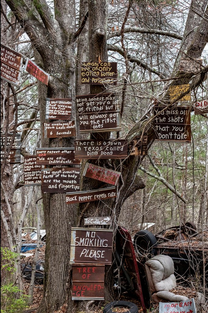 As you wander the trails, you’ll eventually find the Tree of Knowledge. It serves as a spiritual center for the property, adorned with Dean’s hand-painted wooden signs that offer “Dean-isms”—bits of Southern wit, philosophy, and humor.